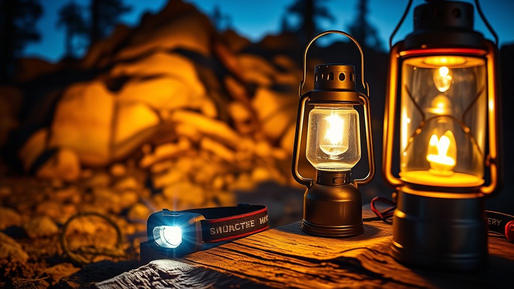 To avoid hidden costs when choosing between headlamps and lanterns, consider their power consumption, durability, and versatility. Headlamps are usually more energy-efficient and last longer, cutting down on battery replacements. Lanterns tend to be bulkier and consume more power, leading to higher ongoing expenses. Investing in high-quality, durable models and maintaining them properly can save money over time. If you want to learn more about these hidden costs and how to manage them, keep exploring this guide.