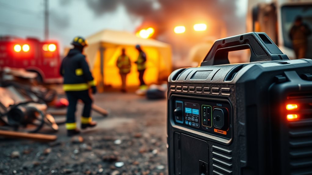 In emergency situations, dependable portable power is crucial to keep communication devices, medical tools, and rescue equipment running smoothly. Solar chargers offer a lightweight, eco-friendly option for continuous daytime recharging, while backup generators ensure power during cloudy weather or overnight. Combining these solutions creates a layered system that maximizes operational uptime and resilience. To discover how these technologies can enhance your response efforts, explore further details below.