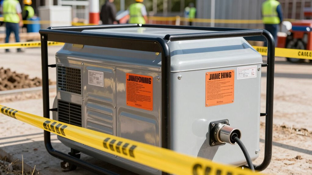 Generator safety isn’t optional—it’s your best defense against deadly hazards like carbon monoxide poisoning, fires, shocks, and loud noise damage. Always place your generator outdoors, away from windows and vents, and guarantee proper ventilation. Regular maintenance, safe fuel handling, and never running it indoors can save your life. Following these key safety rules is crucial, and if you want to know more, you’ll find essential tips that keep you and your loved ones safe.