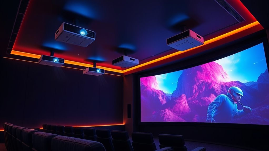 If you’re looking to elevate your home theater experience in 2025, I recommend the top five projectors that deliver true 4K quality with impressive features. From smart models with built-in apps and Dolby Audio to high-brightness options perfect for daytime viewing, these projectors offer excellent picture quality, ample connectivity, and easy setup. Keep exploring to find out which one suits your space best and transforms your movie nights into cinema-like moments.