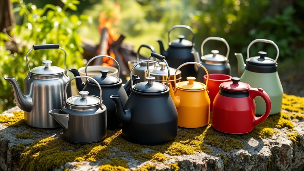 If you’re looking for the 15 best camp kettles for outdoor cooking, I’ve tested plenty to find durable, lightweight, and reliable options. From stainless steel and enameled steel to ultralight aluminum, these kettles suit solo trips or group cooking. Features like fast heating, sturdy handles, and compact design matter most in outdoor gear. To discover the top choices that balance performance and portability, keep going—there’s plenty more to help you find the right one.