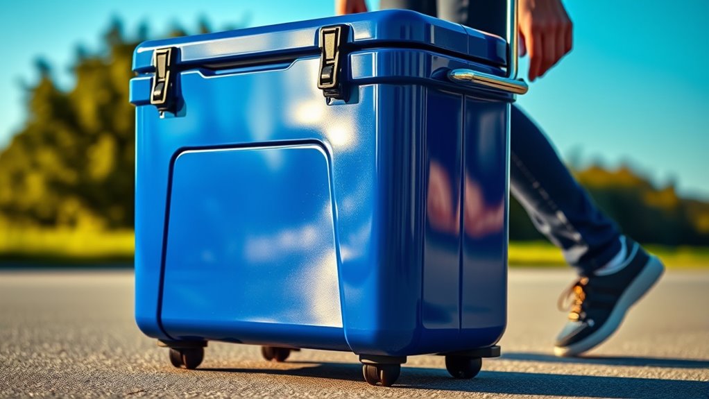 Durability and build quality set the foundation for a reliable cooler, but insulation performance determines how well it keeps contents cold over time. The effectiveness of insulation in a compact cooler with wheels mainly depends on the thickness and quality of foam or polyurethane used in its walls. Better insulation, especially with advanced features like triple-layer walls or radiant heat barriers, can considerably extend ice retention—often up to 3 to 5 days in ideal conditions. An airtight, seamless lid and secure closures are vital for preventing cold air from escaping, further enhancing ice longevity. Proper pre-cooling and packing techniques, such as using ice packs and minimizing air gaps, also maximize insulation efficiency, ensuring your food and drinks stay cold longer during outings.