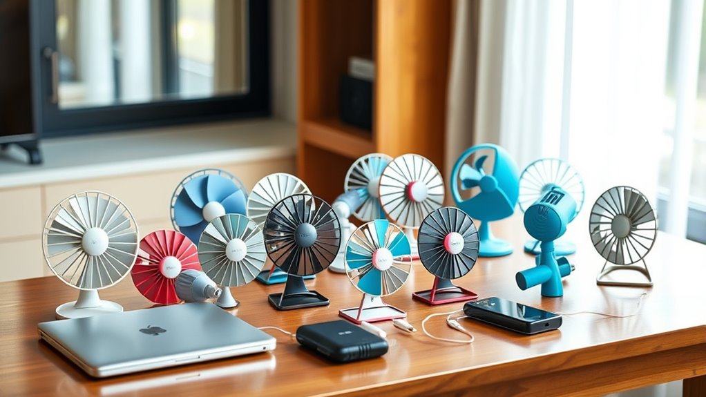 I’ve found the 15 best compact USB fans that keep me cool anywhere, whether at my desk, outdoors, or traveling. They’re lightweight, easy to carry, and offer adjustable speeds for personalized comfort. Most are USB-powered, some rechargeable, and many operate quietly, perfect for sleeping or working. With features like tilt, rotation, and foldability, they make cooling convenient on the go. Keep exploring, and you’ll discover more about choosing the right one for your needs.