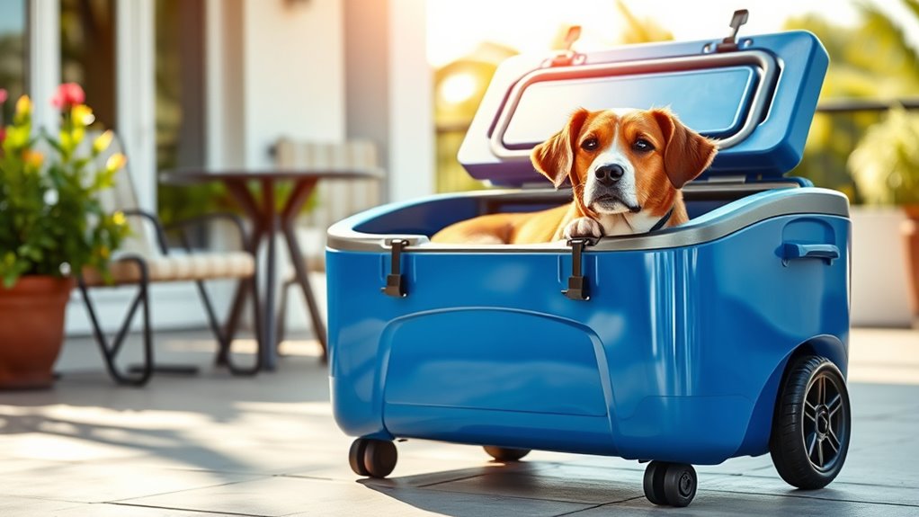 Looking for the best coolers with wheels that keep your pets cool and comfortable? I’ve found options ranging from rugged 60-quart models to compact soft-sided carriers, all designed with insulation and mobility in mind. Features like impact-resistant wheels, leakproof linings, and ample storage make outdoor trips easier. Whether you need a durable hard-shell or lightweight soft-sided cooler, I’ll help you discover top picks that suit your needs perfectly. Keep going to find out more about these great choices.