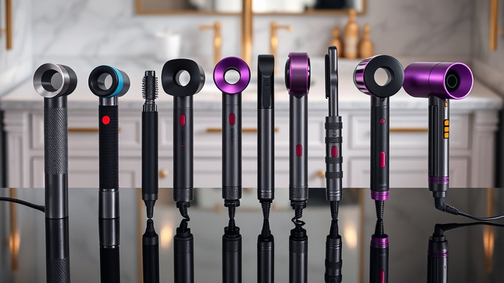 Ever wondered if a Dyson Airwrap alternative will work well with your hair type? It’s essential to check if it has adjustable heat and airflow settings suited for different textures and thicknesses. This guarantees safe styling without damage. Also, look at the attachments—make sure they’re compatible with your hair length and type, whether you have fine, thick, curly, or straight hair. Features like intelligent temperature control or ion technology are a bonus, especially if your hair is sensitive or prone to frizz. Versatility matters too—choose a device that offers curling, straightening, and volumizing options to match your styling needs. Finally, reading user reviews and product specs can give you insight into how well the device works with your specific hair type.