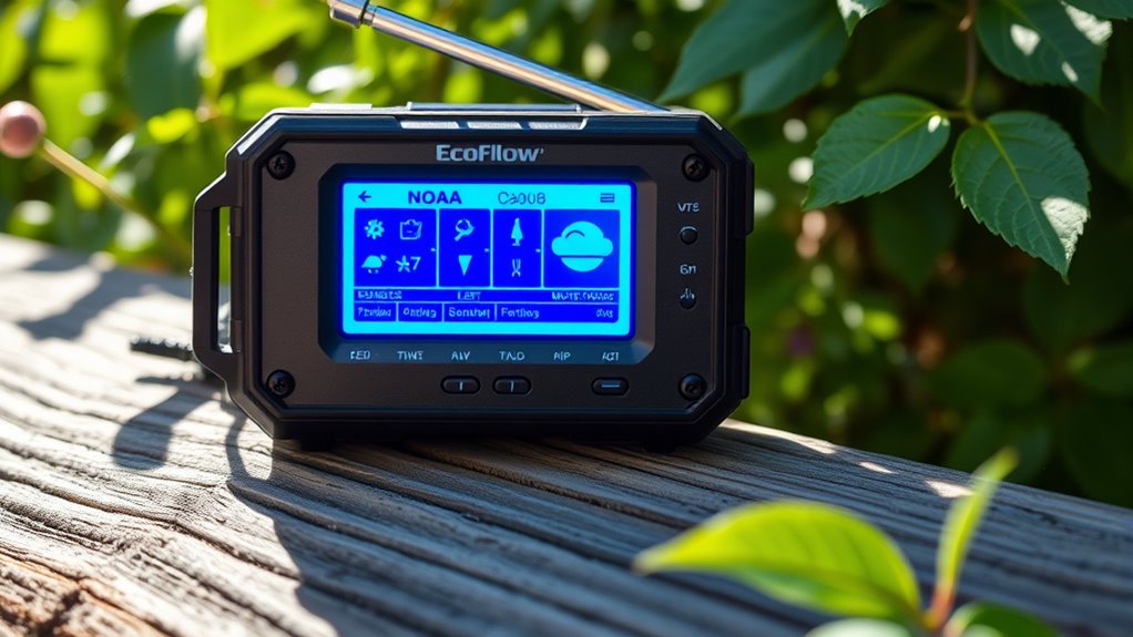 Waterproof or water-resistant? I’d say most EcoFlow NOAA weather radios are designed with water resistance in mind, so they can handle splashes or light rain. However, they’re not fully waterproof, so don’t dunk them in water or expose them to heavy rain for too long. Always check the specific model’s IP rating or waterproof details to guarantee it meets your outdoor or emergency needs.