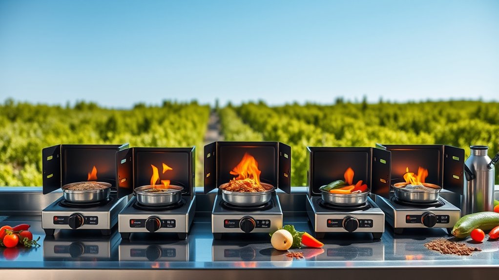 I’ve reviewed the top Energizer butane stoves for 2025, and the best ones offer quick, efficient cooking with powerful heat outputs and portable designs. Features like auto-ignition, windproof features, and lightweight frames make them perfect for outdoor adventures or emergency prep. Many support dual-fuel options and come with accessories like carry cases and fuel canisters. To find the ideal stove for your needs, keep exploring the options outlined below.