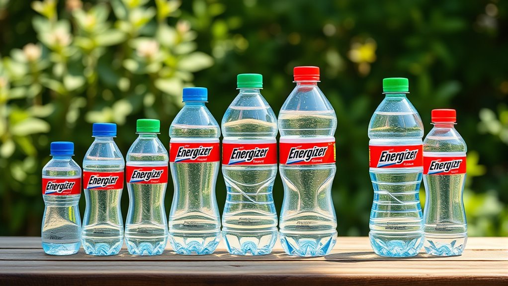 Selecting the right size for an energizer water container depends on your specific needs and how you plan to use it. Consider capacity options like 1.3, 2.6, or 5.3 gallons to match your storage requirements. Smaller containers, such as 1.3 gallons, are portable and ideal for daily hydration or limited space. Larger sizes, like 2.6 gallons, are popular for family emergency preparedness and outdoor activities because they hold more water. Make sure the container fits your intended use—whether for quick access, bulk storage, or transporting in backpacks or vehicles. Also, measure your available storage space to ensure the container’s size is practical for your environment. Choosing the right capacity guarantees you stay hydrated without unnecessary bulk or inconvenience.