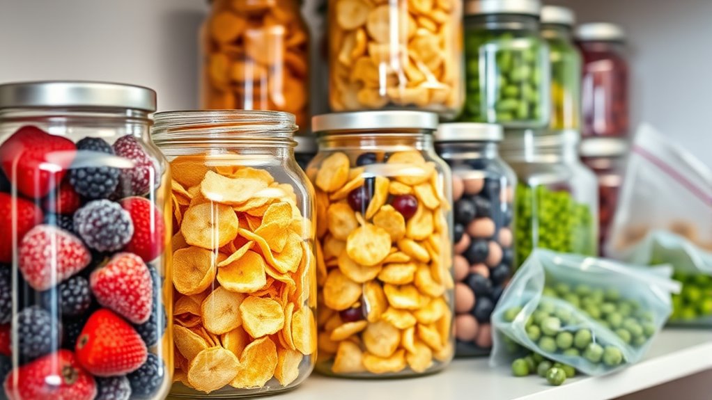Choosing freeze-dried foods that last long on the shelf requires paying close attention to storage needs. These foods can last anywhere from 10 to 30 years, but proper storage is crucial to maximize their lifespan. Keep them in airtight, moisture-proof containers like vacuum-sealed pouches or cans to prevent spoilage. Humidity, light, and temperature fluctuations can drastically cut their shelf life, so store them in a cool, dark, and stable environment. Regularly checking your supplies for damaged packaging and resealing or replacing as needed will help preserve flavor, nutrients, and texture. By maintaining ideal storage conditions and vigilance, you can ensure your freeze-dried foods stay safe, tasty, and ready for whenever you need them.