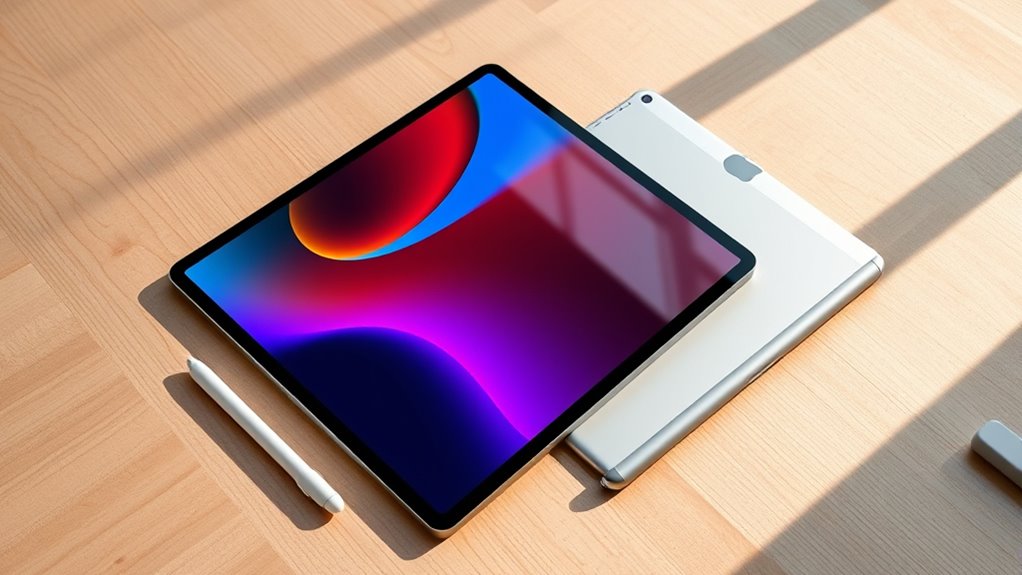 Are display size and quality important factors when choosing between the iPad Pro 2025 and the iPad Air? Absolutely. The iPad Pro offers an 11-inch or 13-inch Liquid Retina display with higher resolution options, delivering vibrant visuals that are perfect for detailed work like drawing or multitasking. Its ProMotion technology with a 120Hz refresh rate guarantees smoother visuals and quick responsiveness, enhancing note-taking and creative tasks. Meanwhile, the iPad Air generally has a 10.9-inch or 11-inch Liquid Retina display with True Tone and P3 wide color, providing excellent brightness and color accuracy. The larger Pro screens can boost productivity but also impact portability, while the Air’s more compact size makes it easier to carry around. Your choice depends on whether you prioritize screen real estate or mobility.