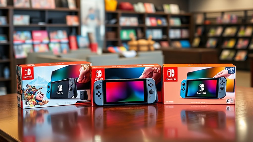 To make the most of your Nintendo Switch 2 bundle, paying attention to additional features and bonuses can considerably enhance your gaming experience. Accessories like protective cases, screen protectors, and controller grips boost comfort and help keep your device safe during intense gameplay. Many bundles include extras such as microSD cards, game download codes, or multiplayer accessories, adding great value. Some offer exclusive items like racing steering wheels or ergonomic grips tailored for specific genres. Additionally, bonuses like extended warranties or online memberships can improve your overall gaming experience. Comparing bundles for these extra features ensures you select the most extensive package for your needs. By considering these extras, you get more out of your purchase and enjoy a richer, more convenient gaming setup.