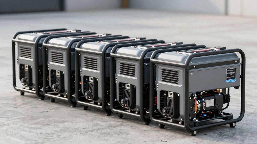 Considering your power needs is just the first step; how easy it is to move and store the generator plays a big role in selecting the right model. Smaller, lighter open frame inverter generators are much easier to transport and store, making them perfect for outdoor activities or emergency use. Compact dimensions and lower weight allow for effortless carrying or moving without extra equipment. Many models include built-in handles or wheels that notably enhance mobility. Size and weight also impact storage options, whether in vehicle trunks, sheds, or camping setups—especially if you’re a frequent traveler. The key is finding a well-designed generator that balances power capacity with manageable size, giving you convenience without sacrificing performance.