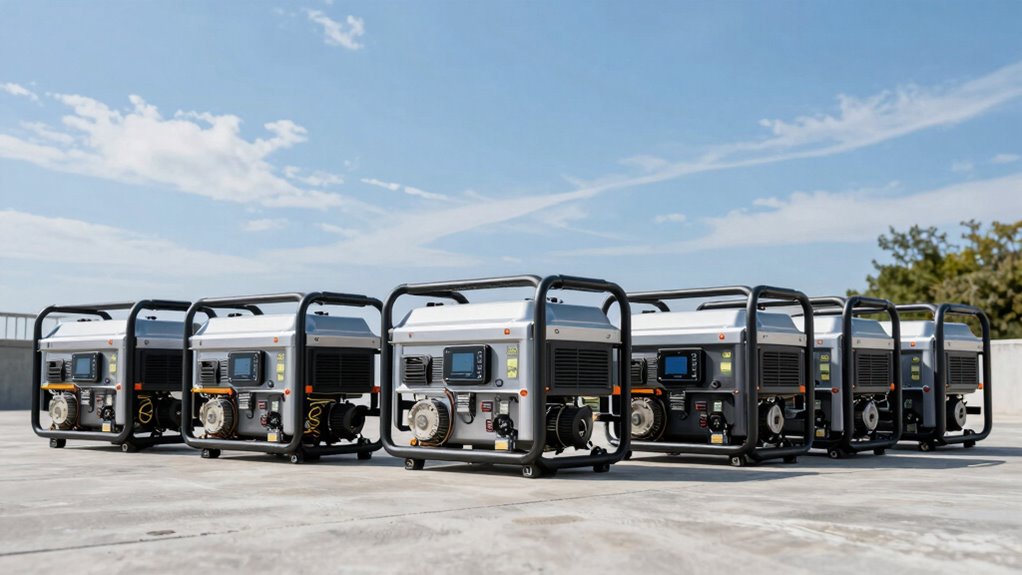 When it comes to guaranteeing your portable generator can easily be moved and positioned when needed, focusing on portability features is vital. Look for models with built-in wheels and telescoping handles, making transportation smooth and effortless. If weight is a concern, choose lightweight options, ideally under 60 pounds, for easier setup and relocation. Compact design dimensions also help, allowing you to store and maneuver the generator in tight spaces. A sturdy, reinforced frame is essential to withstand frequent handling and transport, ensuring durability. Additionally, convenient features like remote start or quick-connect ports can simplify mobility and operation, saving you time and effort. Prioritizing these features ensures you’ll have a generator that’s not only powerful but also easy to move and position whenever needed.