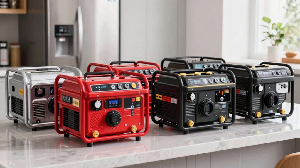 The size and portability of a portable generator are essential factors to take into account, especially when powering a refrigerator or freezer. A compact model weighing less than 50 pounds makes transportation and storage much easier, which is vital during outdoor activities or emergencies. Features like wheels and ergonomic handles greatly enhance mobility, reducing the effort needed to move the generator around. Larger generators with higher wattage capacities tend to be bulkier and heavier, limiting their portability. It’s important to consider the overall dimensions and weight to guarantee the generator fits in designated storage spaces, such as RV compartments or vehicle trunks. Balancing power needs with lightweight, convenient design helps you select a generator that’s both effective and easy to handle.
