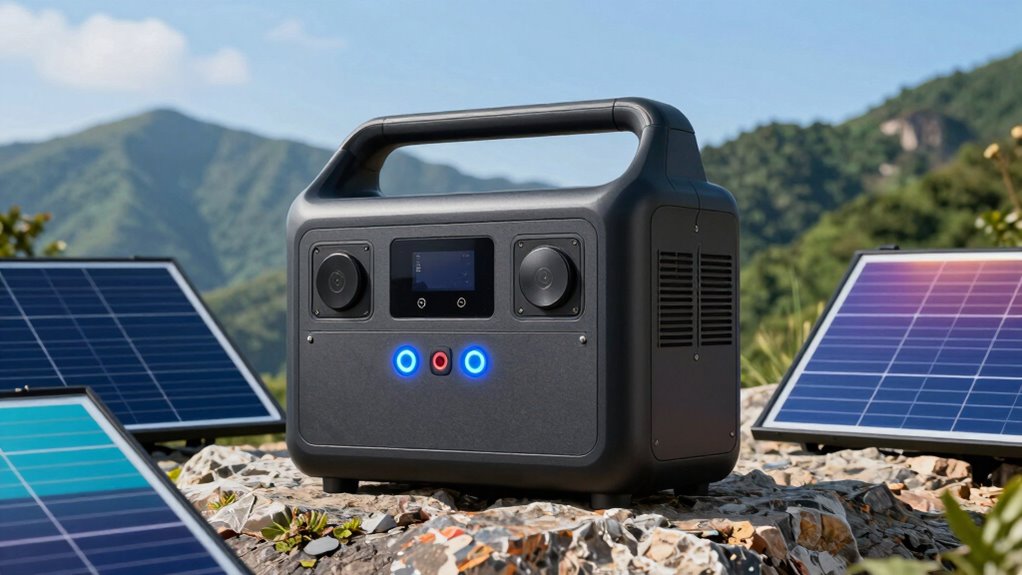 Have you ever wondered if your portable power station can handle all your devices at once? The key is its power output capacity. You need to guarantee the expansion battery can deliver enough continuous power to meet your needs. Check that its rated wattage, like 2kW, supports your high-wattage appliances and multiple devices simultaneously. Also, consider the peak power output to handle surges from devices like refrigerators or power tools without overloads. It’s crucial to verify that the power outlets—AC, USB, and DC—match the types and numbers of devices you plan to connect. Finally, a robust power management system is essential to distribute and regulate power efficiently, preventing fluctuations or damage. All these factors ensure your setup is both safe and capable of handling your power demands.