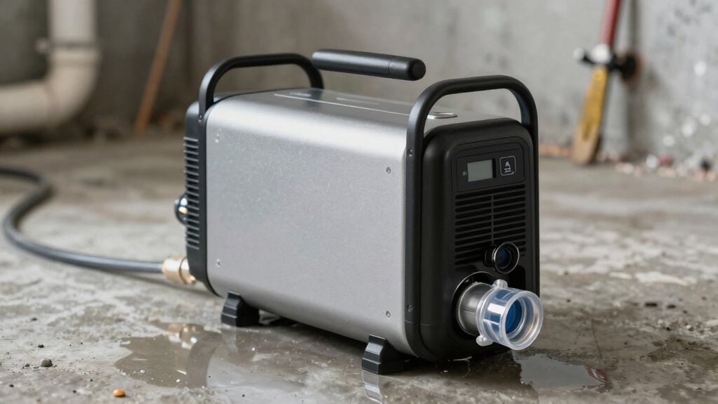 Choosing the right portable water pump hinges largely on its power and capacity, which directly impact how effectively it can drain a flooded basement. The pump’s horsepower (HP) determines how much water it can move quickly—higher HP usually means greater flow rates. Capacity, measured in gallons per hour (GPH) or liters per hour (LPH), indicates how much water it can transfer in a set time. The maximum head height, or vertical lift, shows how high the pump can push water, vital for basements with varying water levels. Pumps with higher flow rates and lift capacities excel at rapid removal of large water volumes. Selecting a pump with adequate power and capacity guarantees efficient drainage, preventing overloads and reducing wear on the motor, making your job easier and faster.