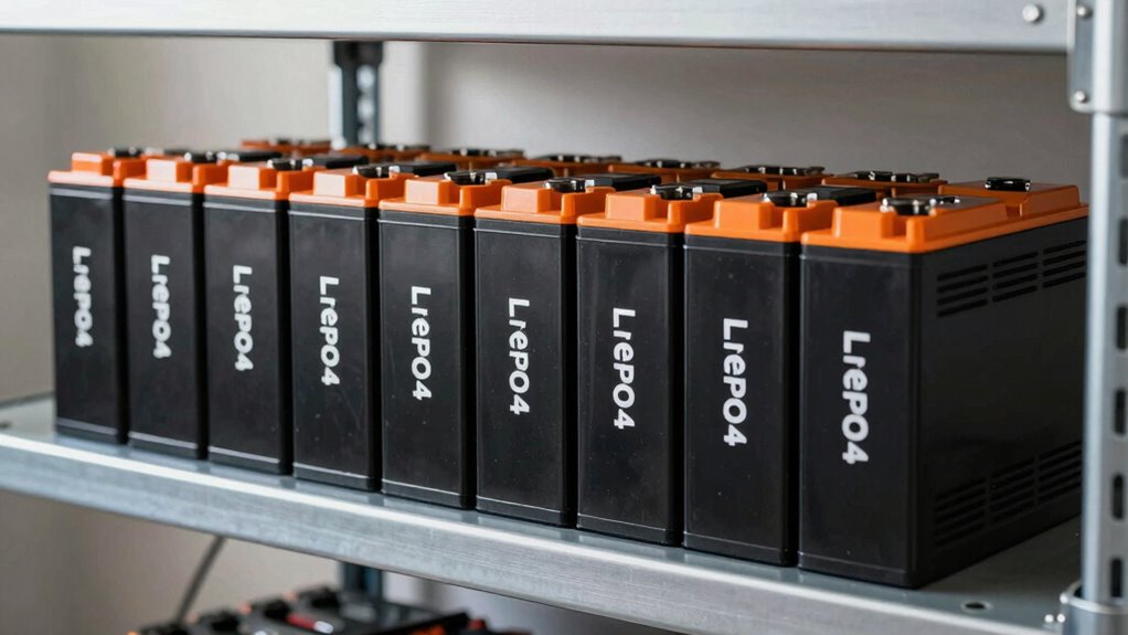 You’ll want a sturdy, well-ventilated rack that can handle the weight and size of the Lifepo4 batteries. Make certain the rack is grounded properly to prevent electrical issues. Keep enough space around the batteries for cooling and maintenance. Use appropriate wiring and connectors, following the manufacturer’s guidelines. Finally, guarantee your setup complies with local safety codes to avoid hazards and ensure peak performance.