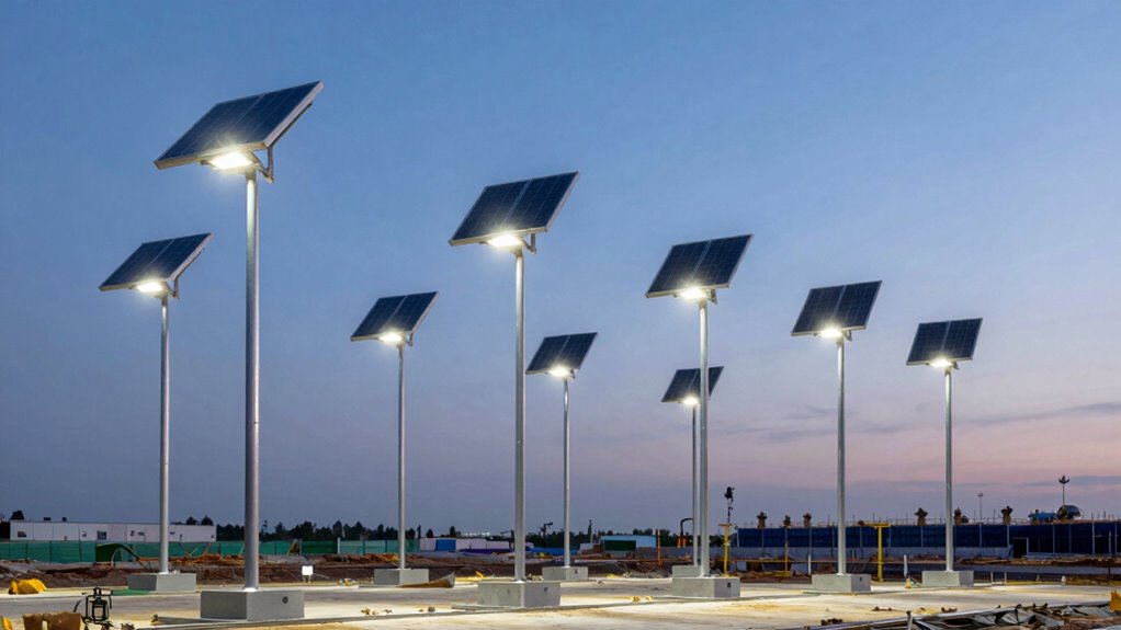 Determining the right power capacity for a solar light tower hinges on understanding your jobsite’s specific illumination needs. I start by evaluating the total area that needs lighting and how bright it must be to ensure safety and efficiency. I also check the battery capacity, measured in milliamp-hours (mAh), to confirm it can sustain continuous operation over the required work hours, often 14-15 hours. Next, I appraise the LED lights’ wattage—higher wattage, like 10,500W, demands a larger or more efficient solar panel and battery system. I make sure the solar panel’s charging capacity matches or exceeds energy use during peak hours to avoid shortages. Finally, I consider extra features like motion sensors or remote controls that might increase overall power needs.