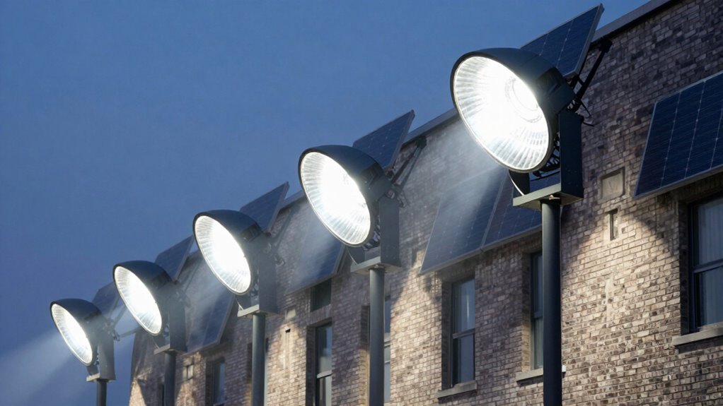 Choosing a solar security floodlight system for a commercial setting depends heavily on its power source efficiency. The system’s ability to convert sunlight into usable energy directly impacts its performance and operational costs. High-quality, wattage-optimized solar panels capture more sunlight, generating greater power even in less ideal weather. Dual panels or high-efficiency options ensure consistent energy absorption during cloudy or rainy days. The size of the battery also matters; larger capacity batteries provide longer run times after full charges. Proper positioning and orientation of the panels maximize sunlight exposure, boosting overall efficiency. By focusing on these factors, you can select a system that reliably powers your security needs while minimizing energy waste and maintenance.
