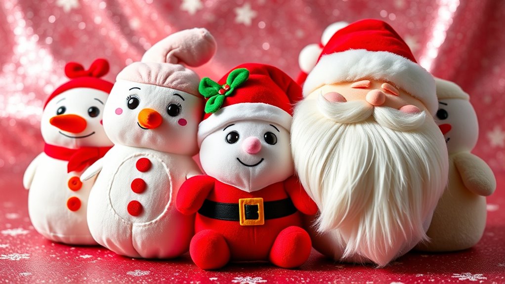 If you’re eyeing the top Squishmallows holiday collectibles of 2025, you’re in for a treat! I recommend checking out the holiday countdown calendar with mini-Squishmallows, the classic 12-inch Grinch plush, Ernesto the Peppermint Latte Elf, Brooke Polar Bear, and Darla the Christmas Deer. Each offers unique seasonal charm and various sizes perfect for cuddling or collecting. Keep exploring to learn more about what makes these plushes must-haves this festive season.