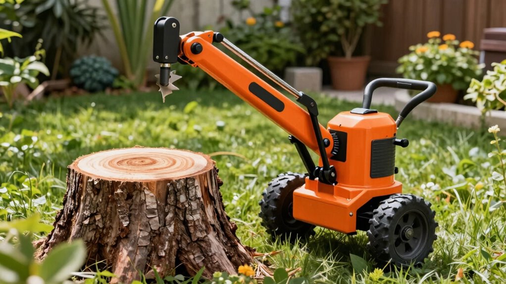 The cutting capacity range of a stump grinder directly influences its ability to handle the size of stumps on your property. Most residential models have a capacity between 9 to 15 inches in diameter, which suits many homeowners’ needs. Choosing a grinder with the right cutting capacity guarantees you can remove stumps efficiently, including those partially below ground level. Keep in mind, the overall capacity depends on both the wheel diameter and the maximum cutting height above ground. To select the best model, consider the typical size of stumps on your property. If you have larger stumps, opt for a grinder with a higher capacity. This way, you’ll save time and effort, making your stump removal process smoother and more effective.