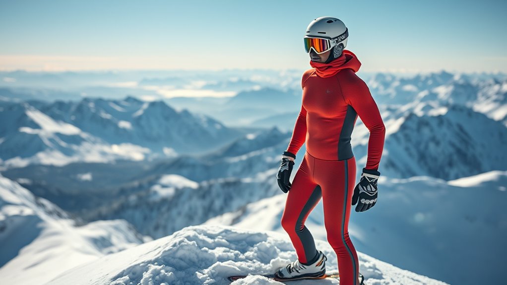 Selecting the right thermal underwear for skiing depends heavily on matching its insulation level to the outdoor temperatures you’ll face. I consider the expected conditions: mild winter days require lighter, moisture-wicking fabrics that keep me dry, while extreme cold calls for heavier options with fleece lining or wool blends. I look for fabrics that offer quick-drying properties to prevent moisture buildup and keep my skin dry, reducing hypothermia risk. Breathability is also essential, allowing excess heat and moisture to escape as I move. For very cold environments, I choose thermal layers with added insulation to ensure warmth without bulk. By aligning the insulation level with the severity of the weather, I stay comfortable and focused on the slopes, no matter how freezing it gets.