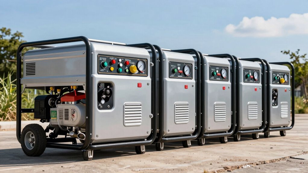 Yes, these generators are suitable for outdoor use in various weather conditions. They’re built with durable, weather-resistant materials that protect against rain, dust, and moderate elements. However, I recommend covering them during heavy storms or snow to prolong their lifespan and guarantee safety. Proper maintenance and storage are key, so always follow the manufacturer’s guidelines to keep your generator running smoothly regardless of the weather.