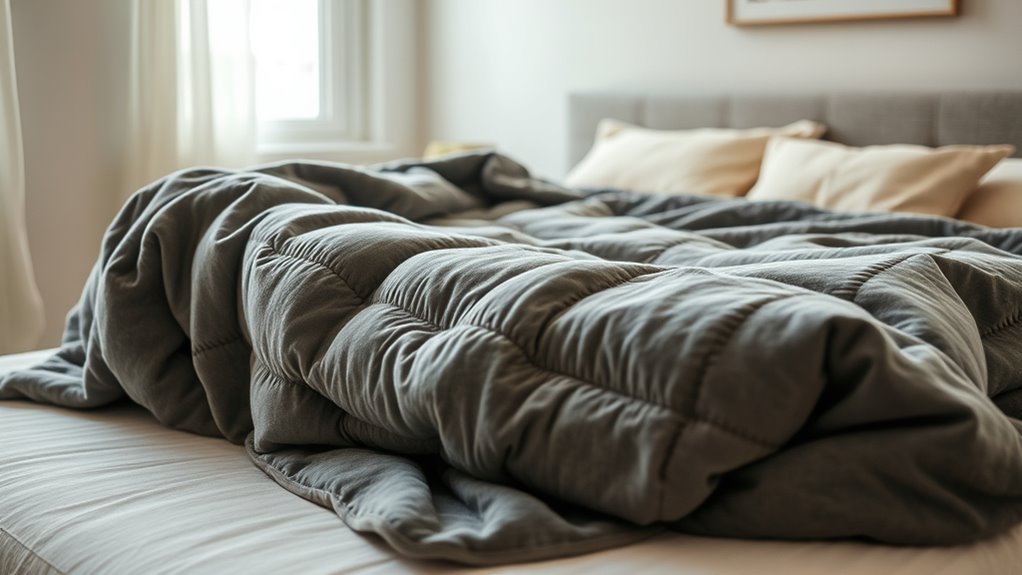 Choosing the right weight for a weighted blanket is essential to maximize its calming effects and guarantee comfort. The general rule is to select a blanket that’s about 8-12% of your body weight, ensuring even pressure distribution that promotes relaxation. If you’re new to using a weighted blanket or have sensitivity, starting with a lighter option—around 5-10% of your body weight—can help you adjust comfortably. An overly heavy blanket can cause discomfort, restrict movement, and potentially increase anxiety. If you have specific health conditions, it’s wise to consult a healthcare professional before making a choice. Proper weight selection optimizes the soothing benefits and helps you experience a more restful, calming sleep without feeling restricted or overwhelmed.