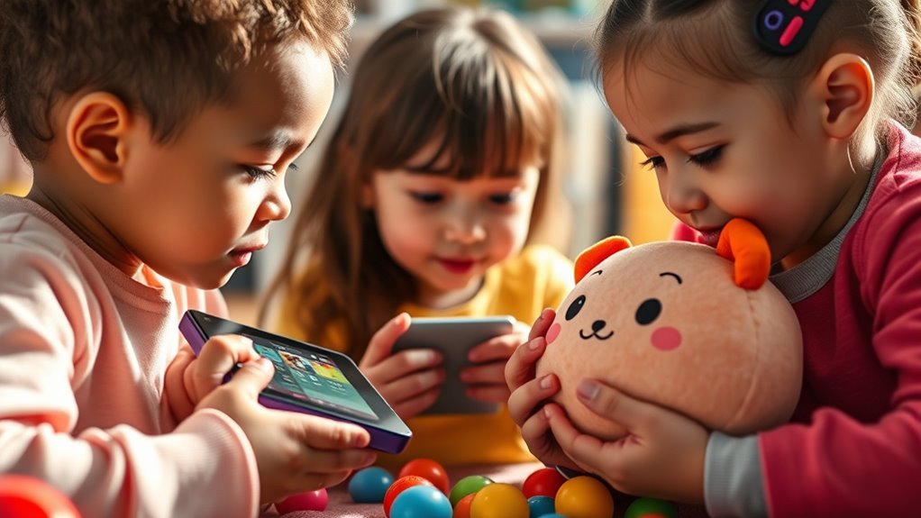 Since both Yoto Player and Toniebox are designed to offer a screen-free listening experience, it’s important to contemplate how each device minimizes digital exposure while maximizing content variety. The Yoto Player uses physical audio cards, giving children access to over 1,000 stories, music, and activities, which encourages independent exploration without screens. Its extensive library supports diverse educational and entertainment options. Conversely, the Toniebox uses figurines called Tonies, which trigger specific stories or songs. While this curates a more familiar and straightforward experience, it limits content variety compared to the Yoto. Both devices successfully reduce screen time, promoting safe, independent play. Choosing between them depends on whether you prioritize a vast, varied library or a simple, character-focused collection.